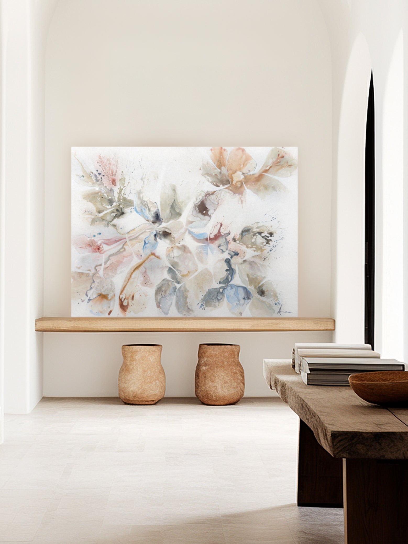 Petals For Armor moves into something more whispered, more contemplative. I worked with translucent layers of paint, building delicate washes of rose, lavender, and sage that seem to breathe across the canvas. I allowed the white space to remain untouched in places, letting its pristine quality become an active participant in the composition.